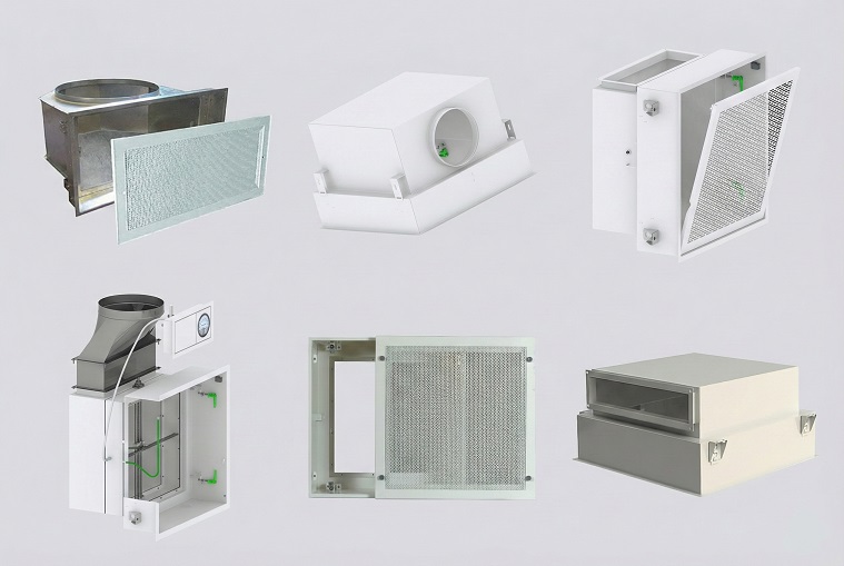 Ils comprennent notamment des caissons terminaux pour salles propres, des caissons de sécurité pour laboratoires et hôpitaux, des cadres support garantissant un montage robuste, ainsi que des grilles pare-gouttelettes destinées à protéger les CTA de l’humidité et des projections d’eau. Cette gamme inclut également des unités de filtration à ventilateur (FFU) intégrant un filtre HEPA, utilisées dans les applications les plus exigeantes du secteur hospitalier, pharmaceutique et des sciences de la vie, où la maîtrise de l’air est un impératif constant.