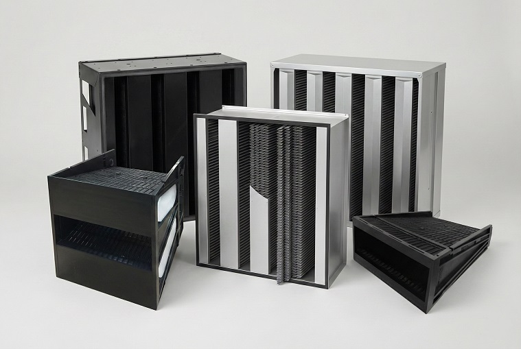 Filtres moléculaires en cellule, plissés ou chargés de média en vrac, conçus pour les caissons à accès frontal ou latéral et utilisant des couches minces de médias adsorbants — charbon actif, alumine ou résines échangeuses d’ions — pour capturer efficacement gaz, odeurs et contaminants moléculaires.