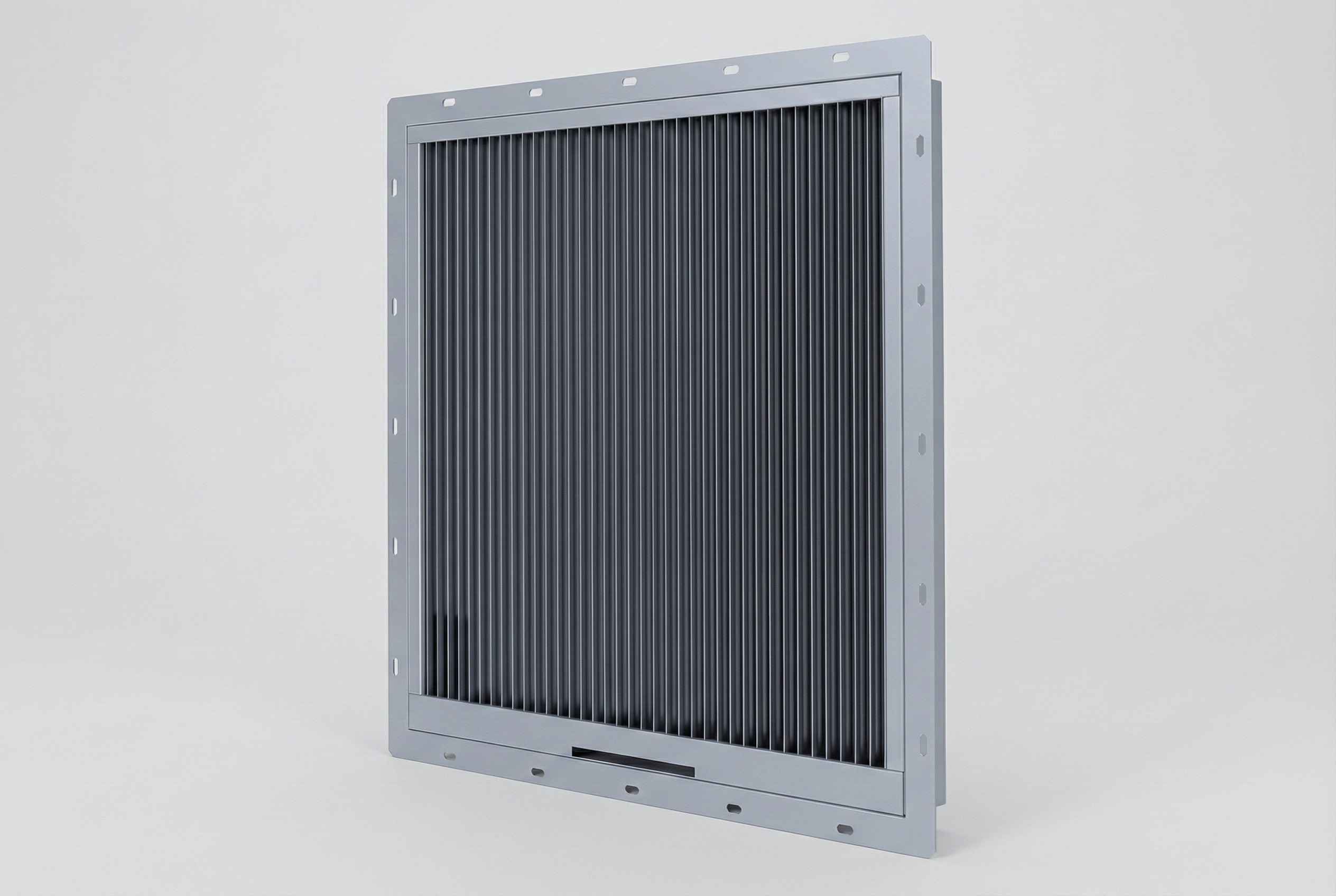 Grilles pare-gouttelettes pour entrées d’air en façade, conçues pour protéger les centrales de traitement d’air en arrêtant et en évacuant efficacement les projections d’eau, assurant ainsi une protection optimale des filtres et des équipements en amont.